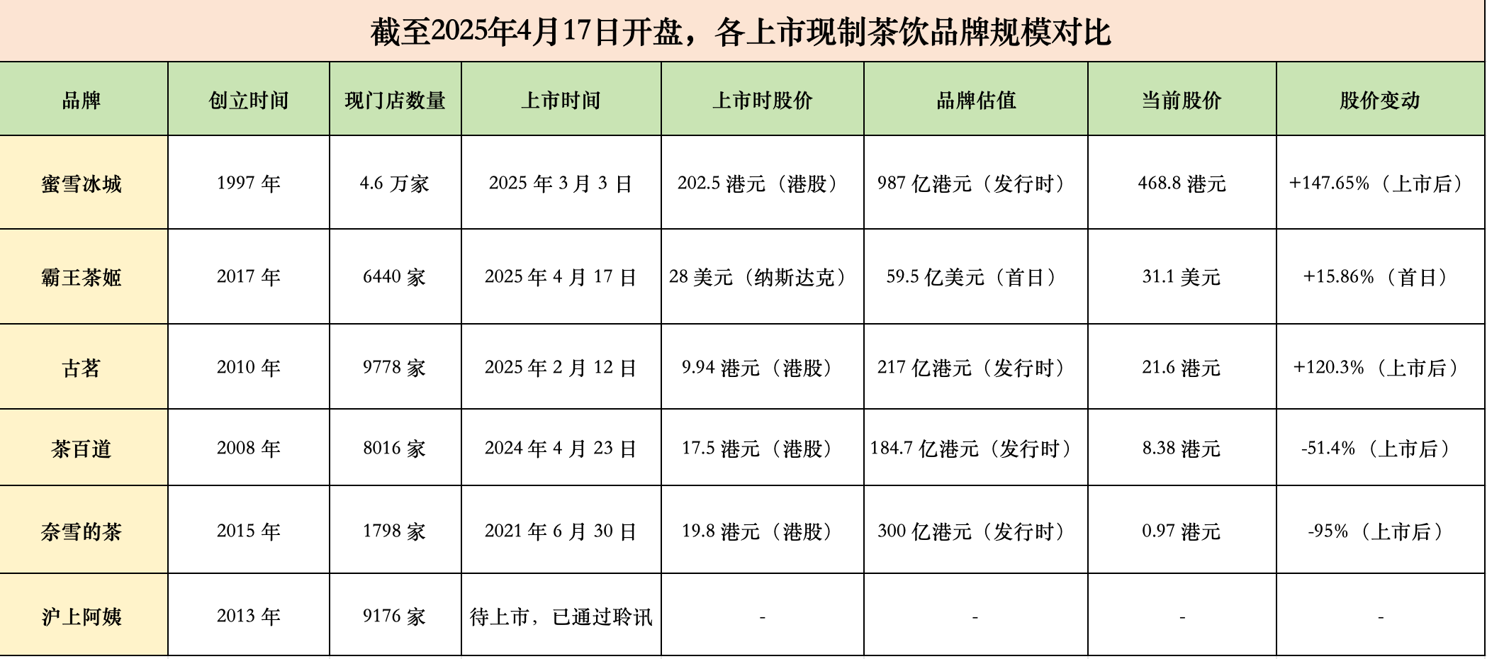 4月23日,沪上阿姨成功通过港交所上市聆讯,正式踏入发行倒计时阶段。就在一周前,纳斯达克交易所的电子屏上,“CHA”(霸王茶姬)的股价一路飙升。这家成立仅5年的茶饮品牌,以28美元的发行价上市,上市首日股价暴涨48%,市值一举突破59.5亿美元,成绩斐然。与之形成鲜明对比的是,早在2021年就已上市的“奈雪的茶”,如今股价却已跌至0.97港元,相较于上市高点,跌幅高达95%,令人唏嘘不已。