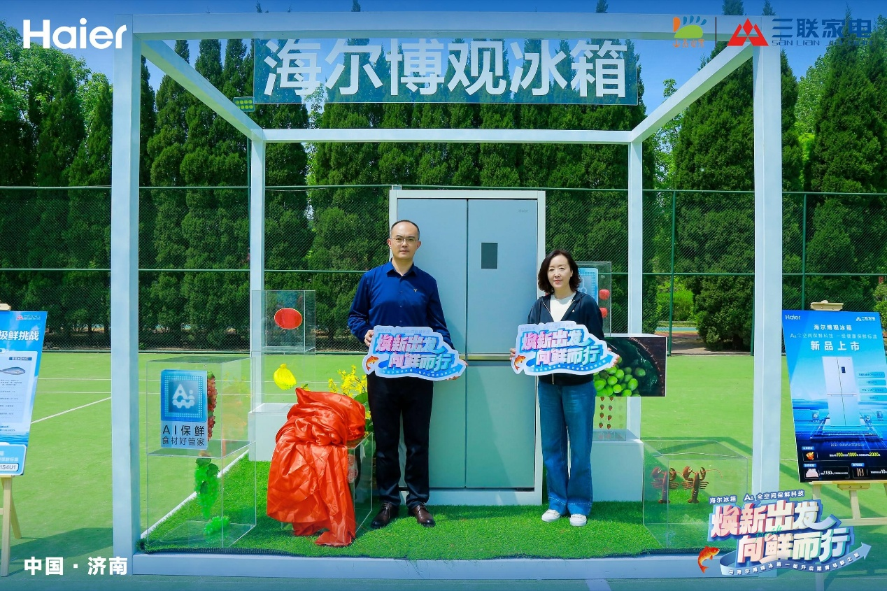 济南三联家电总经理赵霞、海尔济南制冷产业总监么广军为海尔博观冰箱618新品揭幕