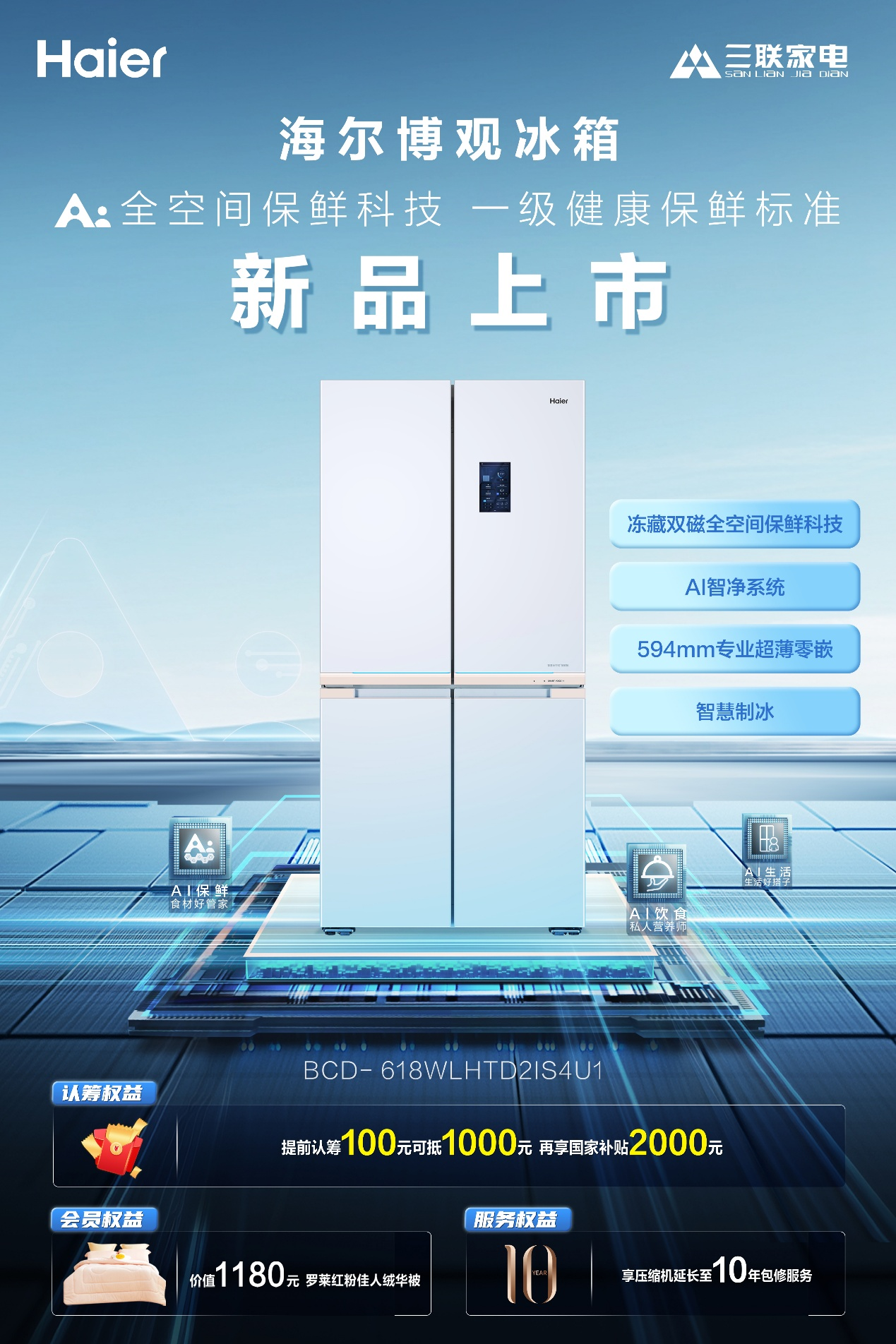 海尔博观618AI全空间保鲜冰箱的诞生,源自于对用户需求的深度洞察。凭借着海尔自己研发的AI保鲜大模型与Deepseek的深度融合,为用户带来AI保鲜、AI管理、AI交互三大革命性体验,让食材在冰箱内如同沐浴山间清风,持久锁住水分与营养,还原每一口“自然本味”。无论是果蔬的鲜嫩、肉类的Q弹,还是干货的酥脆,都能在海尔博观冰箱实现全空间长效保鲜。这款海尔博观冰箱搭载了冷藏冷冻双磁控保鲜科技,据悉,海尔冰箱独有的磁控保鲜技术还荣获了2023年度国家科学技术进步奖。同时这款海尔博观冰箱匹配超薄厨居美学设计,594mm专业超薄零嵌,让冰箱与橱柜实现完美融合,为新婚新居消费者提供了新选择。
