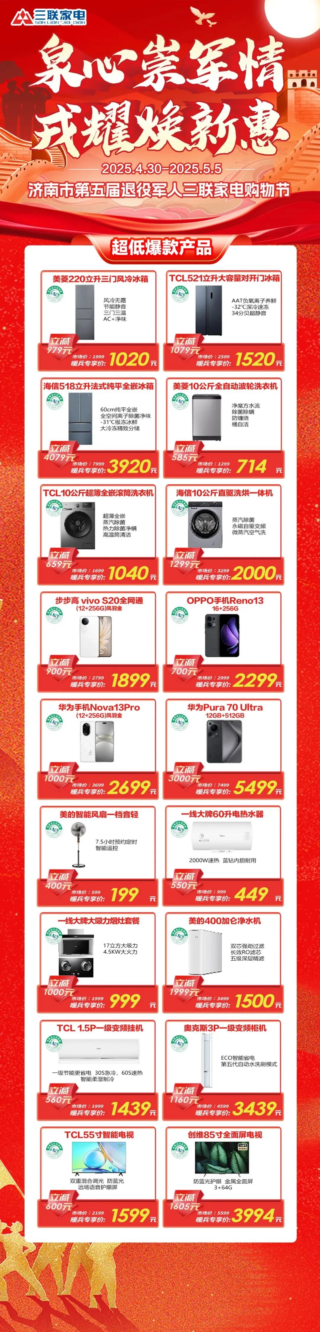 “泉心崇军情・戎耀焕新惠”济南市第五届退役军人三联家电购物节将于4月30日暖心启幕。