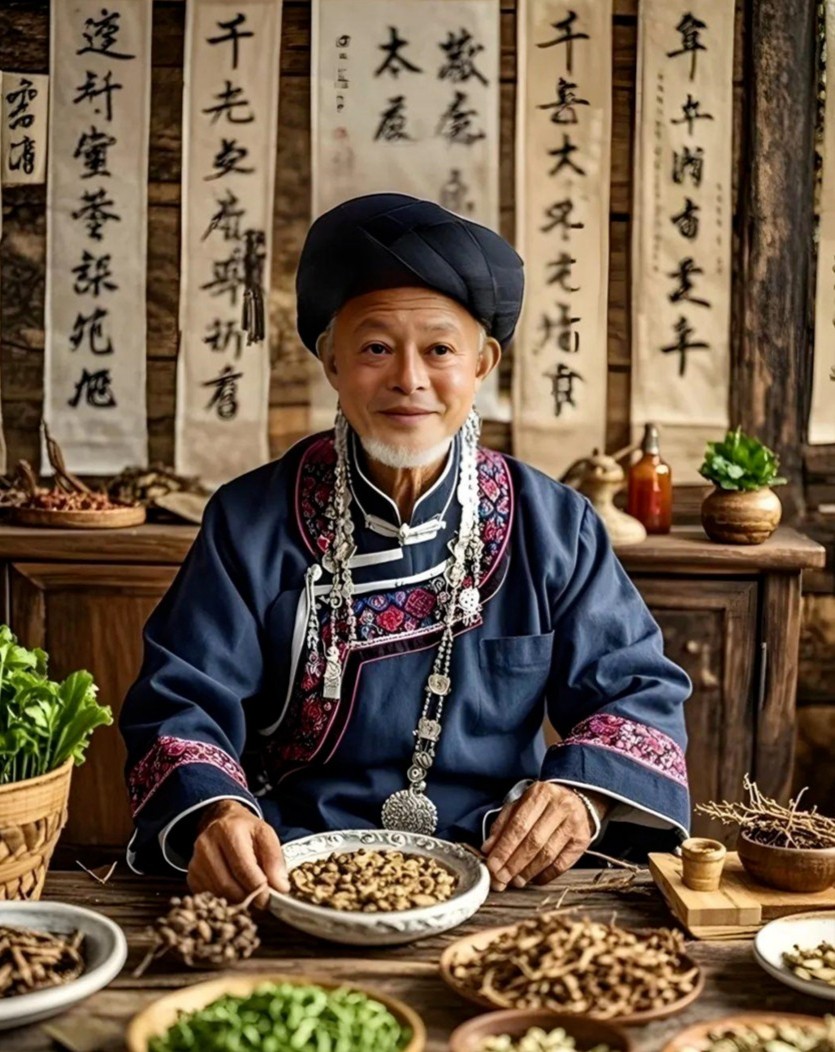一位少数民族打扮的慈祥老大爷坐在一堆中药材后面,画风却是满满的油腻感,画中老人甚至有6个手指头,背景中还不知所云的“汉字书法”……AI生成的假神医——“第56代苗古金贴传承人”唐付政,就这么横空出世了。