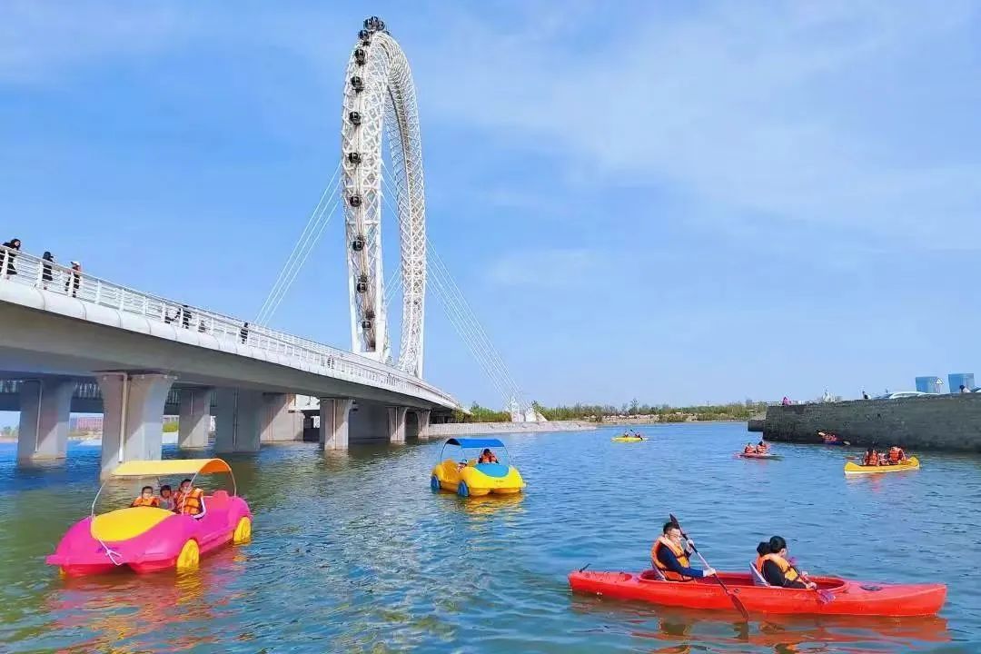 滨海白浪河景区,国家AAA级旅游景区,景区内的标志性游乐项目是渤海之眼摩天轮,整体形象犹如巨龙躯干,呈现出蛟龙出海之势,是“世界最高无轴摩天轮”。