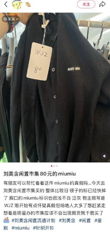 据此前报道,近日,演员刘美含在社交平台发起“闲置流通计划2.2市集”引发关注。有消费者发帖称,自己在刘美含闲置集市购得疑似仿冒的MIUMIU针织衫和LV背包。