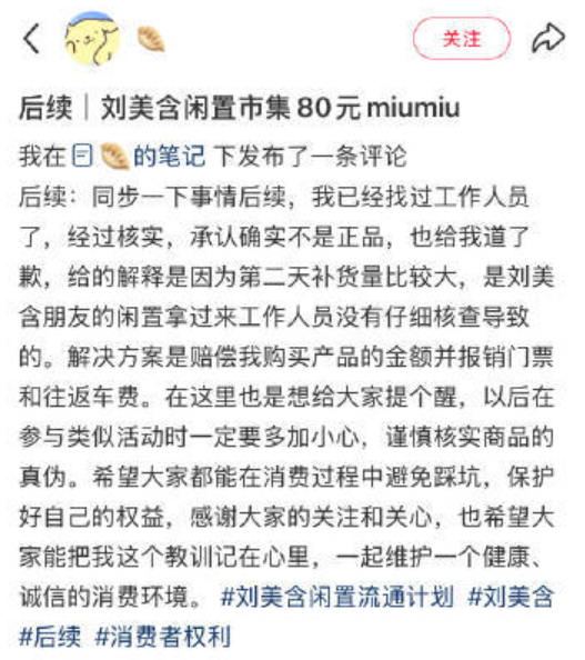 近日,有网友反馈在@刘美含 主办的“闲置流通计划2.0”市集上买到假货。