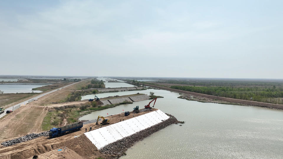 4月29日,在河口黄河北大堤胜利油田建设管理黄河防洪工程维修加固项目现场,运输车辆来来往往,挖掘机“手臂”挥舞,工人们码石砌基,一派繁忙。