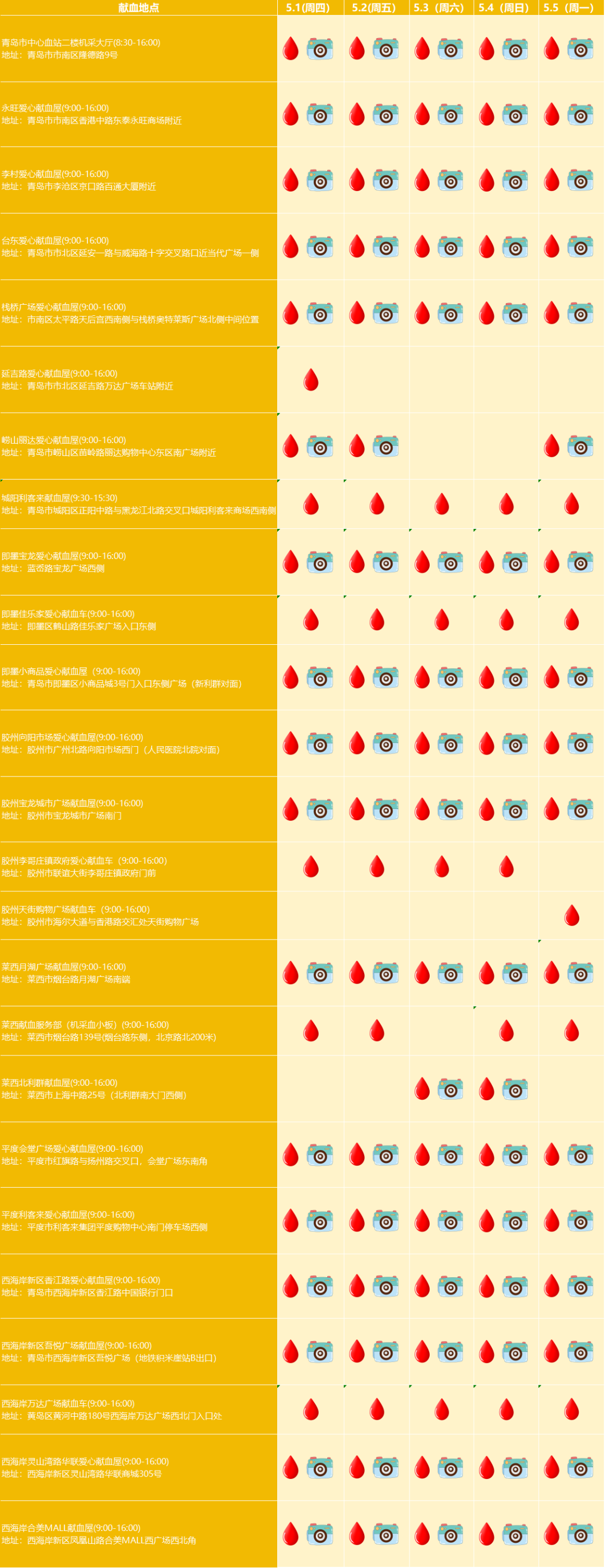 注:血滴表示开放的献血点、相机表示献血点有设置游戏和打卡墙。