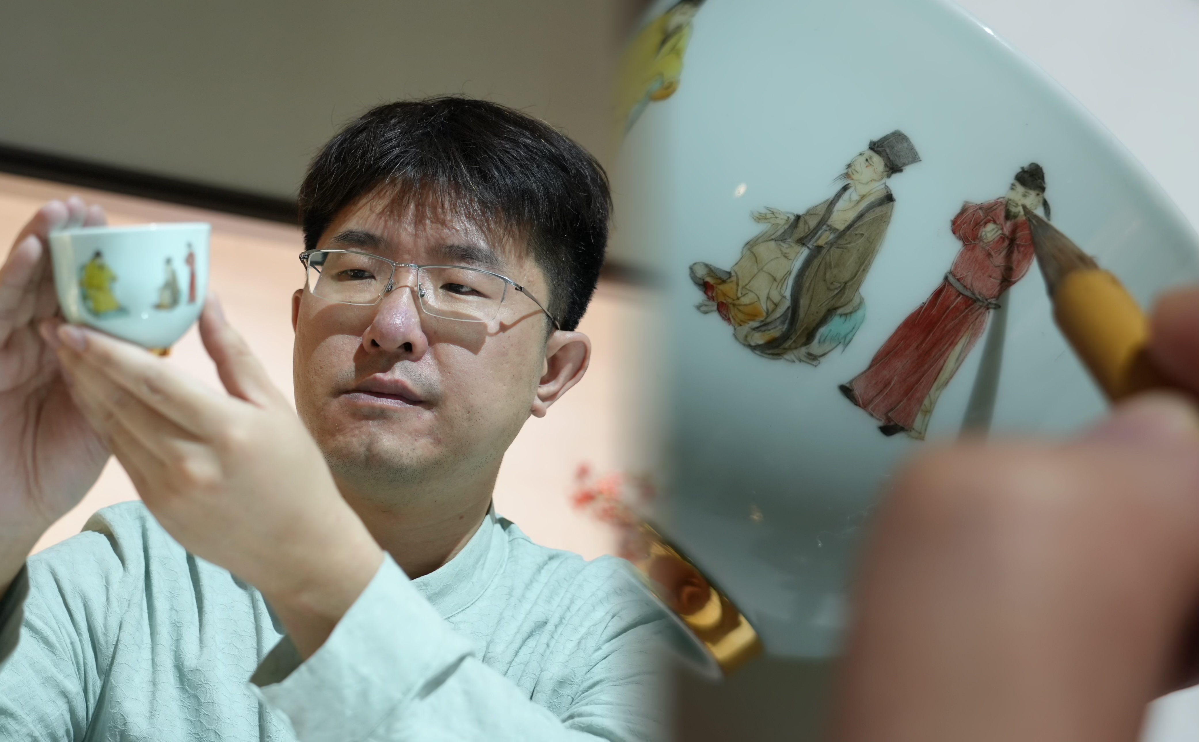 “主人杯器型精致,人物的眉眼比我的笔尖还要细小,然而五官恰恰是人物传神的关键部分,为此,我用大量的时间雕琢,用工笔人物的技法精心刻画他们的神态,表情,一个杯子的画面需要7到8天左右才能完整呈现,一整套杯子将近40天。”高层说,希望通过主人杯,唤醒当代国人的君子之器、国士之风。