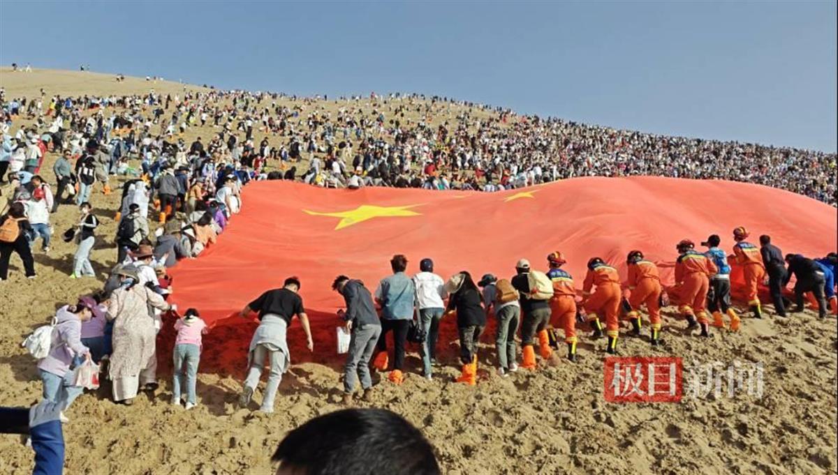 众人接力将国旗升上鸣沙山,纷纷掸去国旗上的沙子