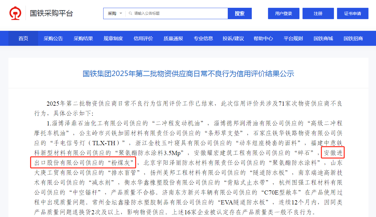 公告内容显示,安徽进出口股份有限公司供应的“粉煤灰”产品质量不合格,该企被认定存在产品质量类一般不良行为。