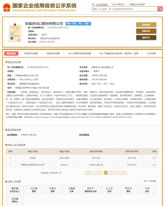 国家企业信用信息公示系统显示,安徽进出口股份有限公司成立于1998年,法定代表人袁孝华,注册资本660.11万元人民币,大股东为安徽国贸集团控股有限公司。安徽国贸集团控股有限公司则成立于2000年,法定代表人何传友,注册资本80130.8509万元人民币。