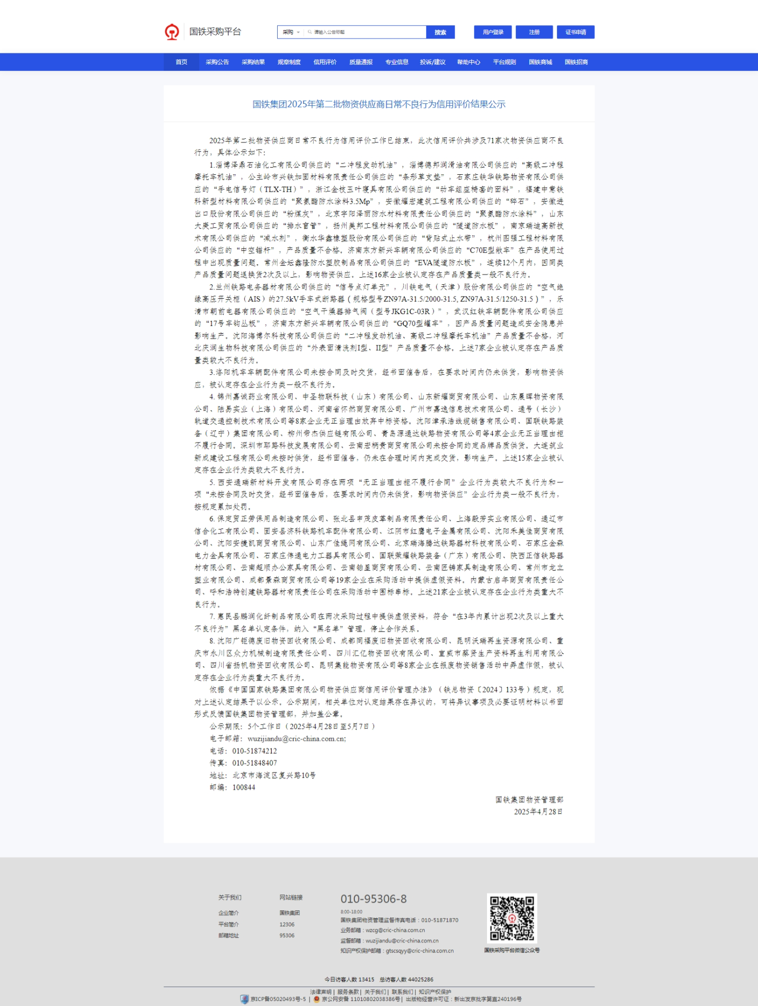 国铁集团2025年第二批物资供应商日常不良行为信用评价结果公示: