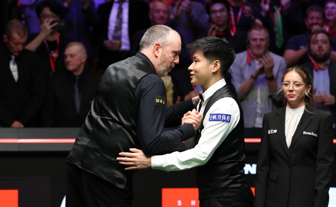 5月5日,赵心童(左二)在比赛后与威廉姆斯相互致意。新华社