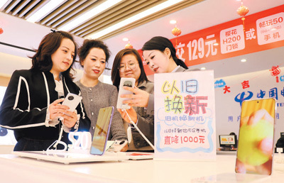 甘肃省平凉市静宁县中街电信公司营业厅里,顾客在挑选手机。王毅 摄(人民视觉)