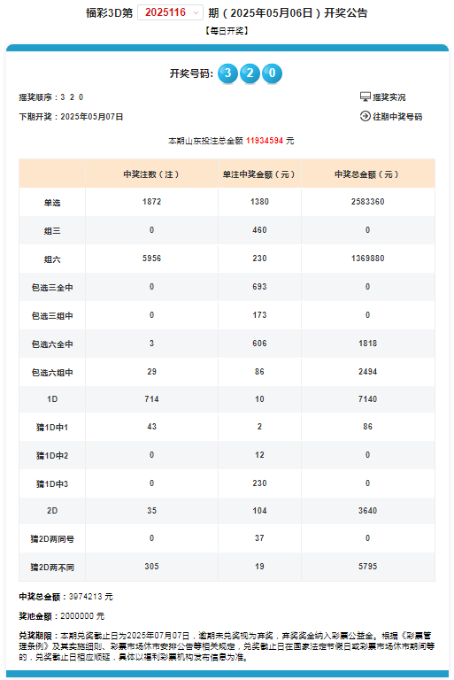 2025年5月6日,3D游戏第2025116期开奖,3D游戏派奖活动的第16期,当期中奖号码为320。