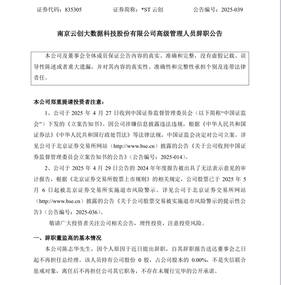 *ST云创最新公告:高级管理人员辞职