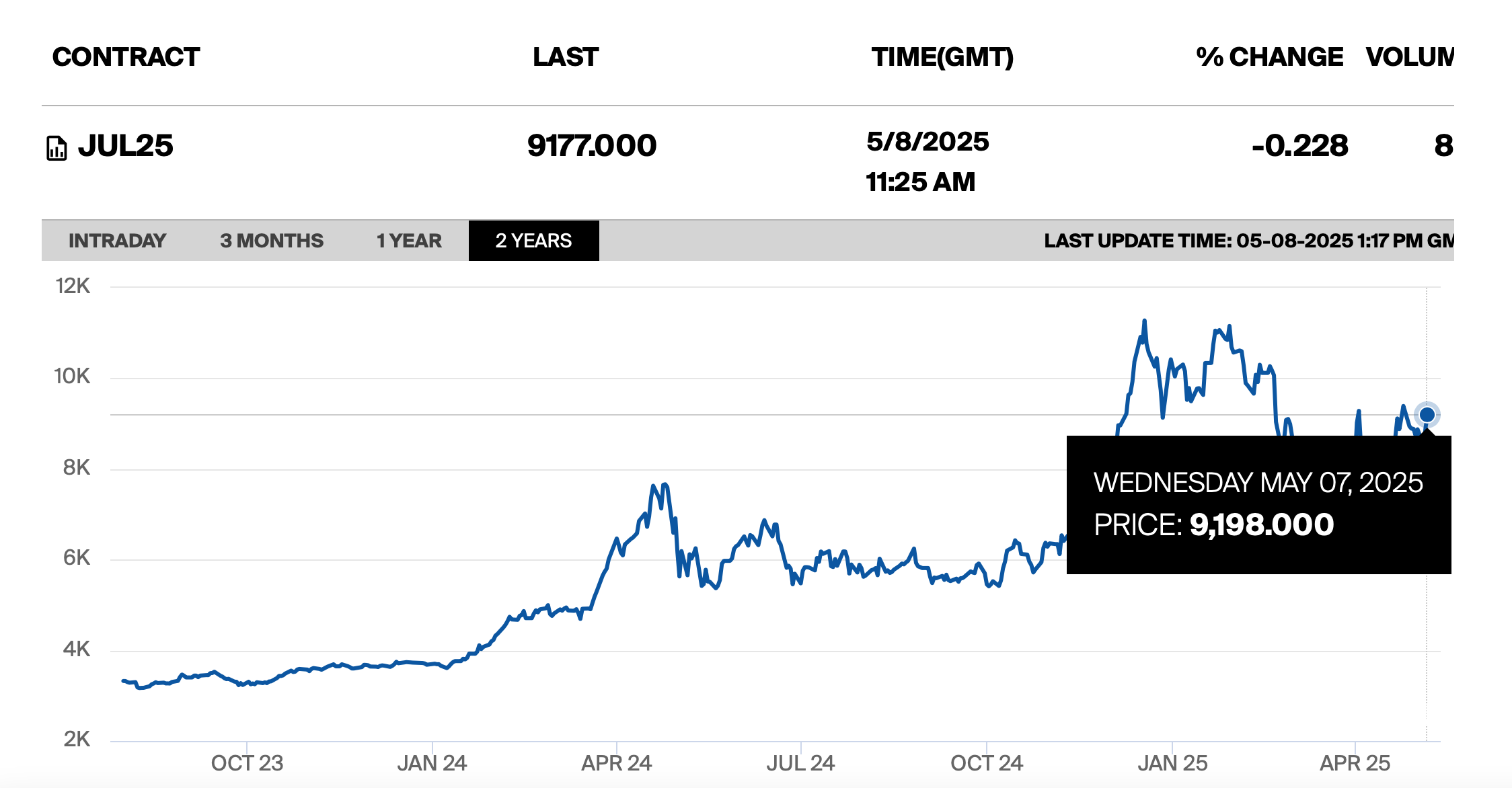 纽约洲际交易所官网显示,自2024年年初以来,纽约可可期货价格不断攀升,由年初的约3600美元/吨上涨至2024年12月中旬的约11200美元/吨。自今年1月底以来,纽约可可期货价格波动回落,截至伦敦时间5月7日,7月交割的可可期货价格约为9188美元/吨。