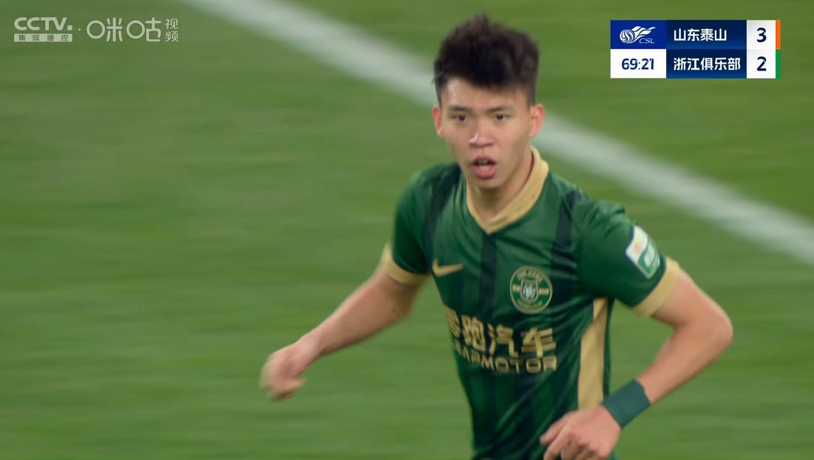 第66分钟,王钰栋近距离打门,但是球偏出了。一分钟后,他再度带球突破,卡扎尔无奈之下在禁区边缘放倒了他,获得了黄牌。随后,浙江队开出任意球,王钰栋从人群脱颖而出,将比分扳成2:3。