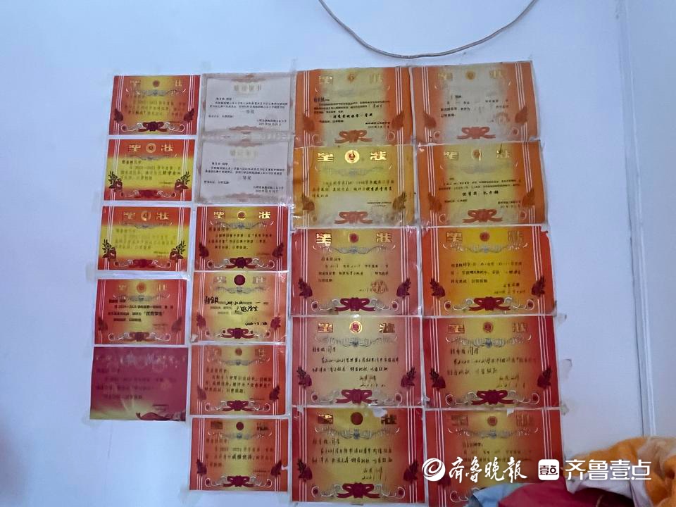 金枝没告诉记者的是,她的学习成绩在整个年级都名列前茅,考班级第一是常有的事,还时不时能考全年级前几名。房间内满墙的奖状就是最好的见证,姥姥自豪地说,这只是其中一小部分。