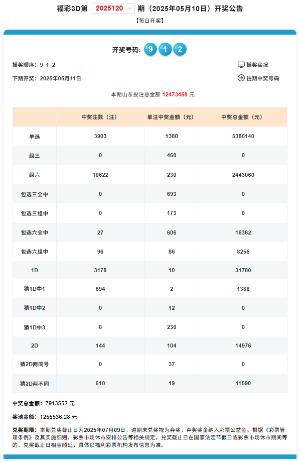 2025年5月10日,3D游戏第2025120期开奖,3D游戏派奖活动的第20期,当期中奖号码为912。