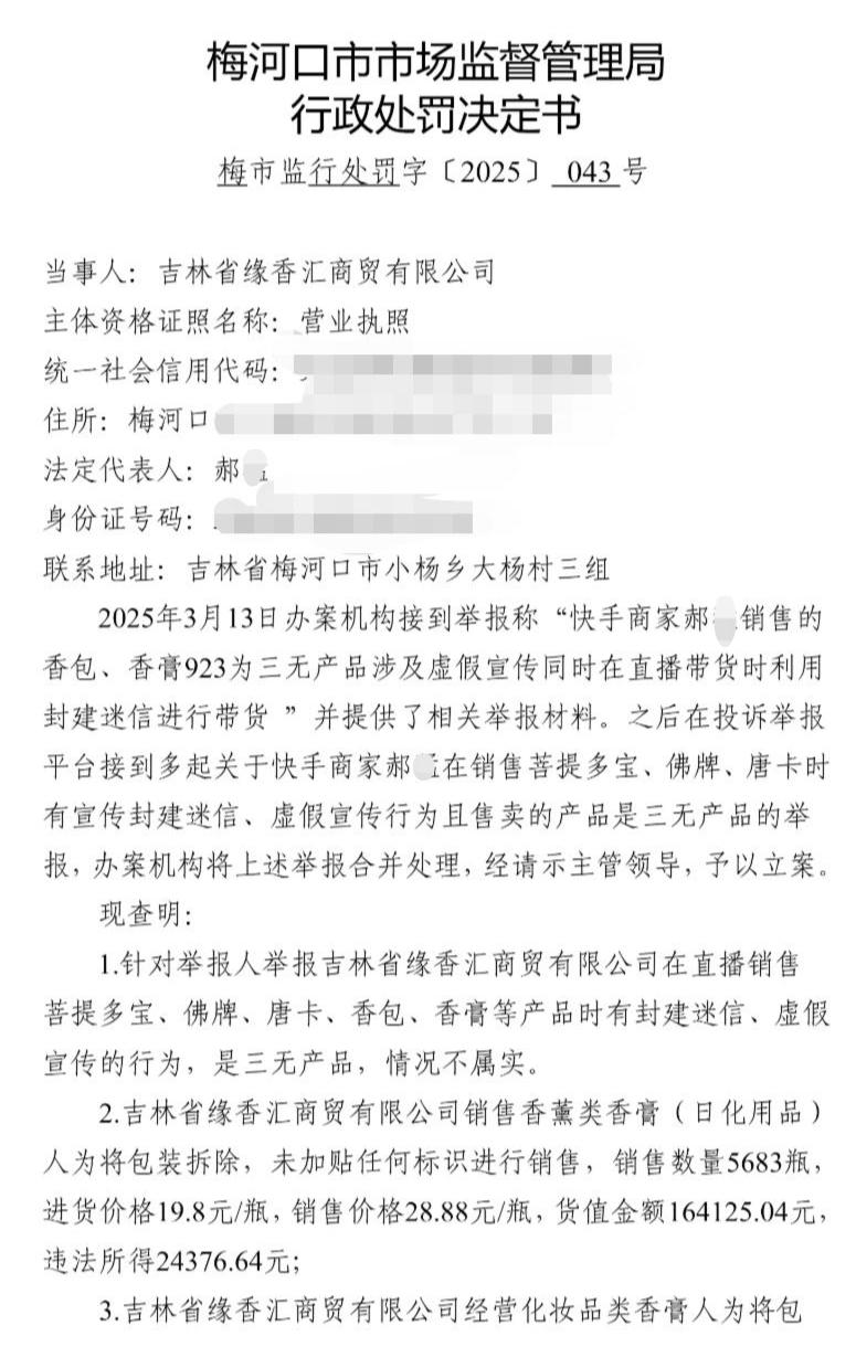 行政处罚决定书显示,2025年3月13日,办案机构接到举报,称郝某销售的香包、香膏为三无产品涉及虚假宣传,同时在直播过程中利用封建迷信进行带货。之后在投诉举报平台接到多起举报。对此,办案机构将上述举报合并处理,予以立案调查。