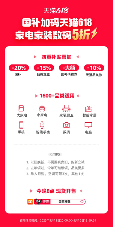 天猫618重磅加码国补,家电、家装、家居、3C数码等品类将低至5折,今晚8点,现货开卖。