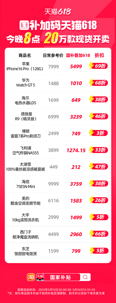 苹果直降2000元,iPhone16 Pro首次进入国补,到手价5499元。大宇10公斤滚筒洗衣机,国补叠加618优惠,打5折,到手价1499元;美的节能空调,打35折,到手价1583元;75寸Mini LED海信电视,打38折,补贴后到手价3759元;西门子极净魔盒洗碗机,打66折,到手价2960元;东芝饭甜甜电饭煲,打5折,到手价799元。
