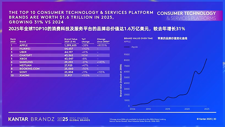 据了解,华为的品牌价值近647亿美元,较去年激增142.4%,这一成绩标志着华为在经历供应链波动后实现“V型反弹”,并从单一产品制造商升级为生态构建者,推动鸿蒙操作系统成为全球第三大移动操作系统,连接超10亿台设备,为用户提供无缝连接的智能生活体验。