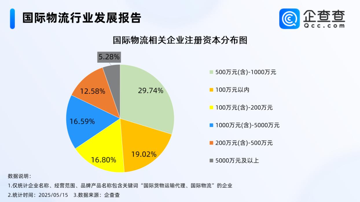 从注册资本来看,注册资本在500万元(含)-1000万元的国际物流相关企业最多,占比29.74%。其次,注册资本在100万元以内的相关企业占比19.02%。注册资本在5000万元及以上的相关企业占比5.28%。