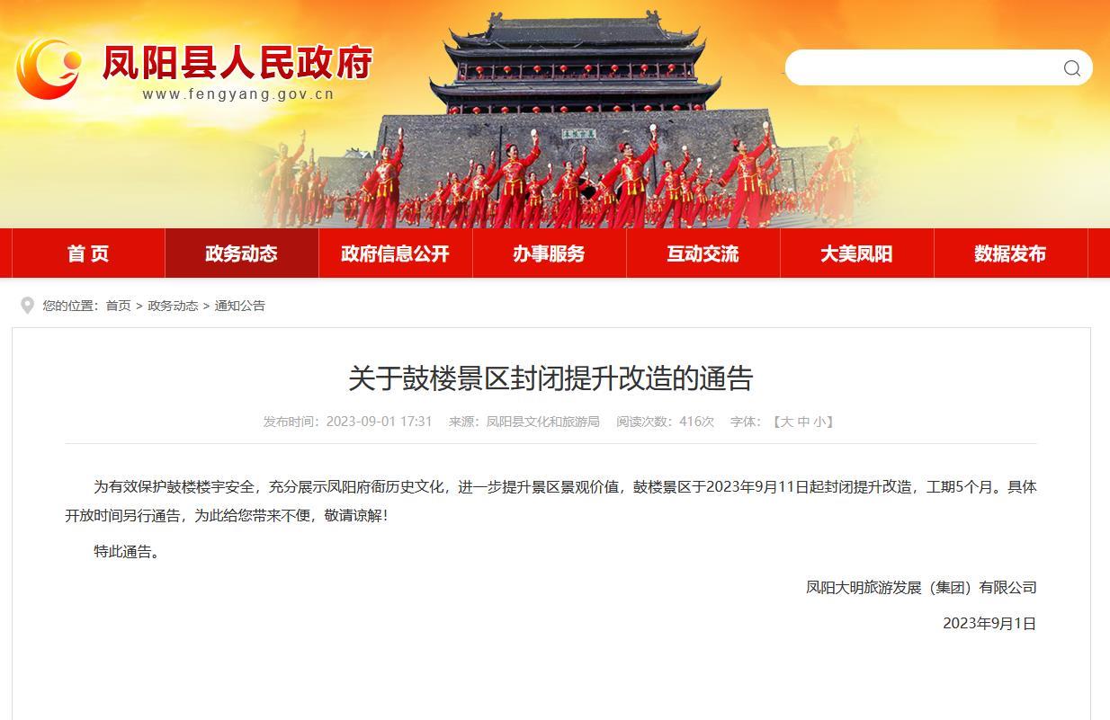 极目新闻记者在凤阳县政府官网查询到,2023年9月1日,凤阳大明旅游发展(集团)有限公司发布过《关于鼓楼景区封闭提升改造的通告》。通告称,为有效保护鼓楼楼宇安全,充分展示凤阳府衙历史文化,进一步提升景区景观价值,鼓楼景区于2023年9月11日起封闭提升改造,工期5个月。