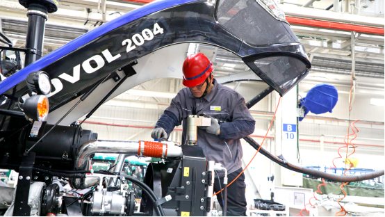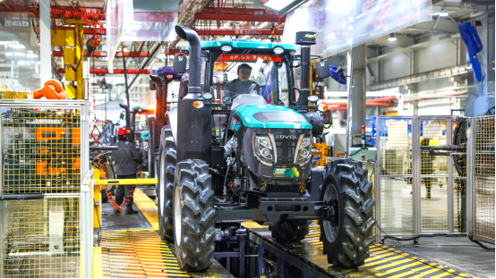 步入潍柴雷沃智慧农业的样机展示区,一系列高端智能农机整齐排列,其中最引人注目的是雷沃全系列的先进机械设备。潍柴雷沃拖拉机工厂内机器轰鸣但井然有序,机械臂精准吊装车架,工人们手持工具默契配合,80多道工序环环相扣。一台台拖拉机在这里逐渐成形,从底盘到发动机,再到驾驶室,最终装配完成。