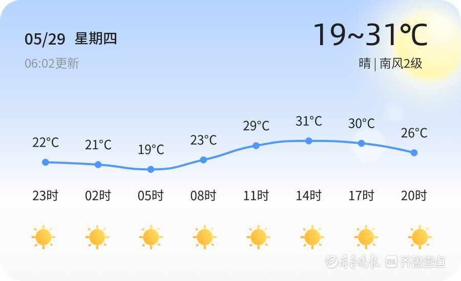 今天是5月29日,星期四,农历五月初三。东营市今日天气晴朗,最高气温31℃,最低气温19℃。目前温度为18.7℃,南风2级,空气湿度59%。空气质量状况为优(PM2.539),适宜户外活动。早晨温差较大,建议市民早晨和夜间出行时注意保暖,中午紫外线较强,出行时请做好防晒措施。