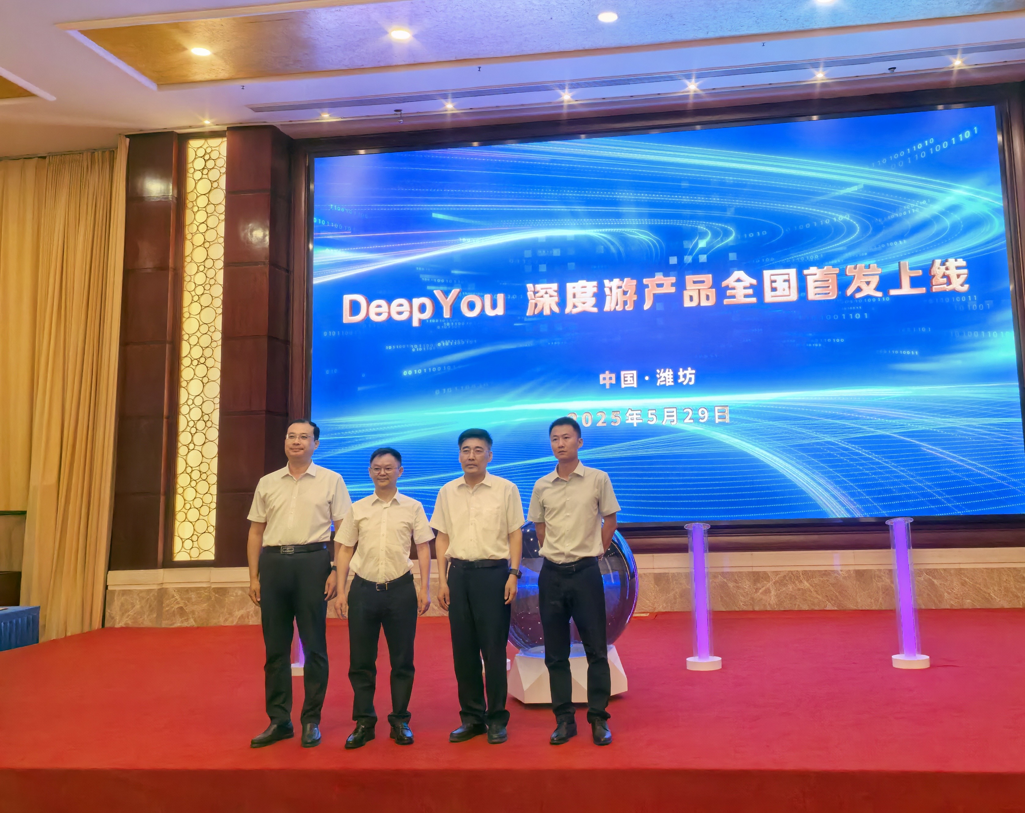 5月29日下午,“DeepYou深度游”产品全国首发活动在世界风筝都潍坊举行。活动现场,北京磁云数字科技有限公司董事长、深度游科技创始人李大学,潍坊市政府党组成员、二级巡视员王金祥,潍坊市文化和旅游局党组书记、局长高强,深度游山东运营中心总经理孙大海共同启动“DeepYou深度游”产品全国首发上线。