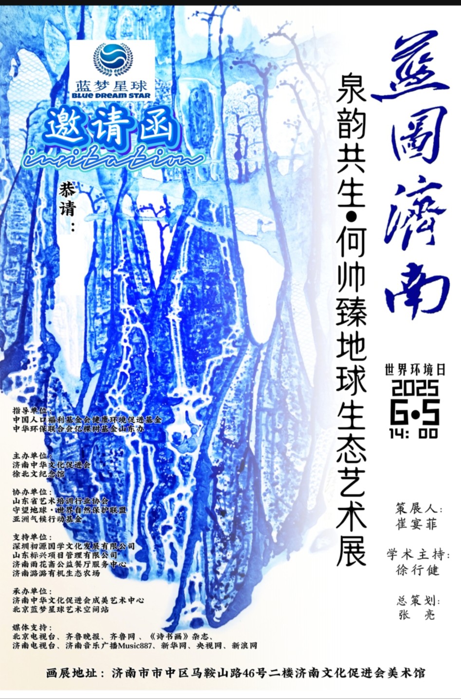 6月5日,由中国人口福利基金会健康环境促进基金和中华环保联合会亿棵树基金发起,山东省济南文化促进会联合主办的“蓝图济南•泉韵共生——何帅臻地球生态艺术展”在泉城济南启幕。作为“蓝图”系列艺术巡展的重要一站,本次展览不仅是对济南“泉城”生态城市定位的呼应,更是以艺术为纽带,推动全球生态文明建设的生动实践。