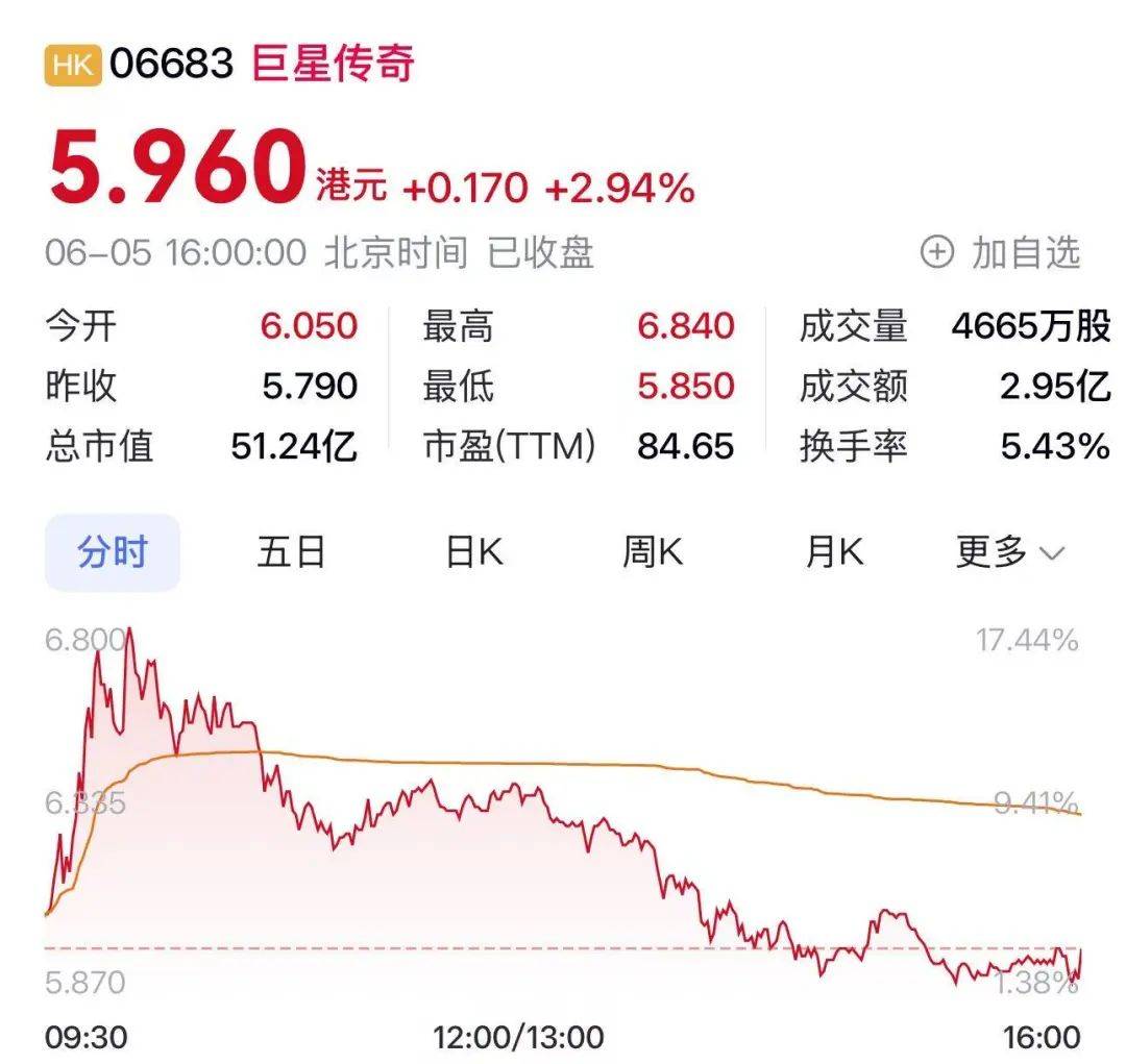 6月5日,由周杰伦母亲叶惠美等关联人士实控的“周杰伦概念股”巨星传奇股价大涨,一度涨超17%,截至收盘涨2.94%,总市值51.24亿港元。这已是巨星传奇连续第3天上涨,此前一天涨超11%,月内已涨超16%。