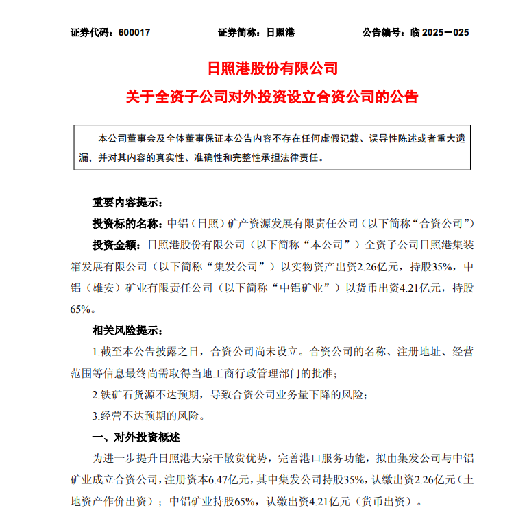 5月27日,日照港发布关于全资子公司对外投资设立合资公司的公告,日照港全资子公司日照港集装箱发展有限公司(以下简称“集发公司”),中铝(雄安)矿业有限责任公司(以下简称“中铝矿业”)共同出资成立中铝(日照)矿产资源发展有限责任公司(以下简称“中铝矿产”)。中铝矿产注册资本6.47亿元,其中集发公司持股35%,认缴出资2.26亿元(土地资产作价出资);中铝矿业持股65%,认缴出资4.21亿元(货币出资)。