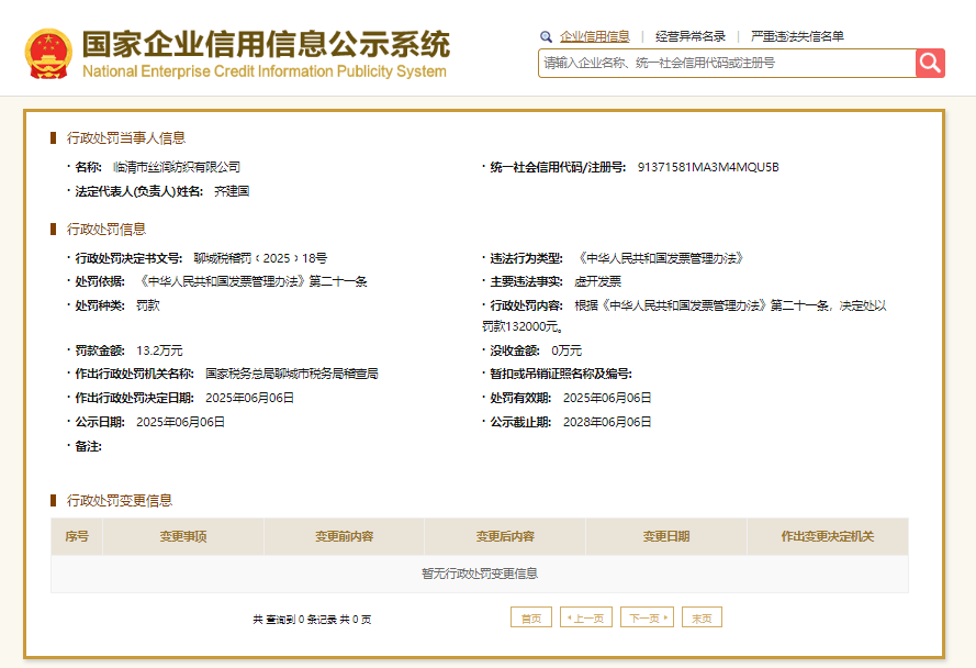 近日, 国家税务总局聊城市税务局稽查局公布一项重大行政处罚决定,临清市丝润纺织有限公司因涉及虚开发票的违法行为,被依法处以13.2万元罚款。