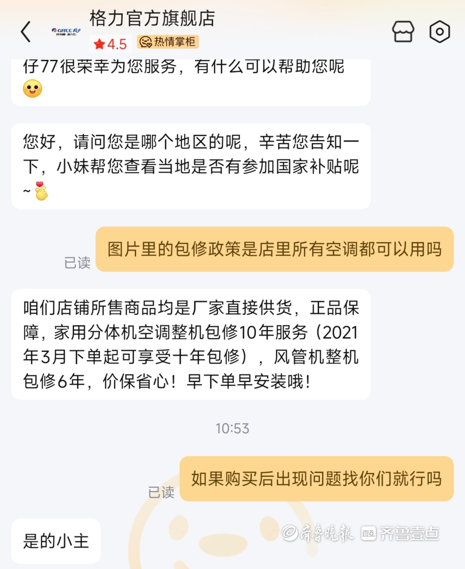 对此,齐鲁晚报·齐鲁壹点记者询问了“格力官方旗舰店”客服,客服表示,店铺所售商品均由厂家直接供货,家用分体机空调整机包修10年服务(2021年3月下单起可享受十年包修),风管机整机包修6年。同时,客服承诺购买后出现问题可以直接联系官方旗舰店。