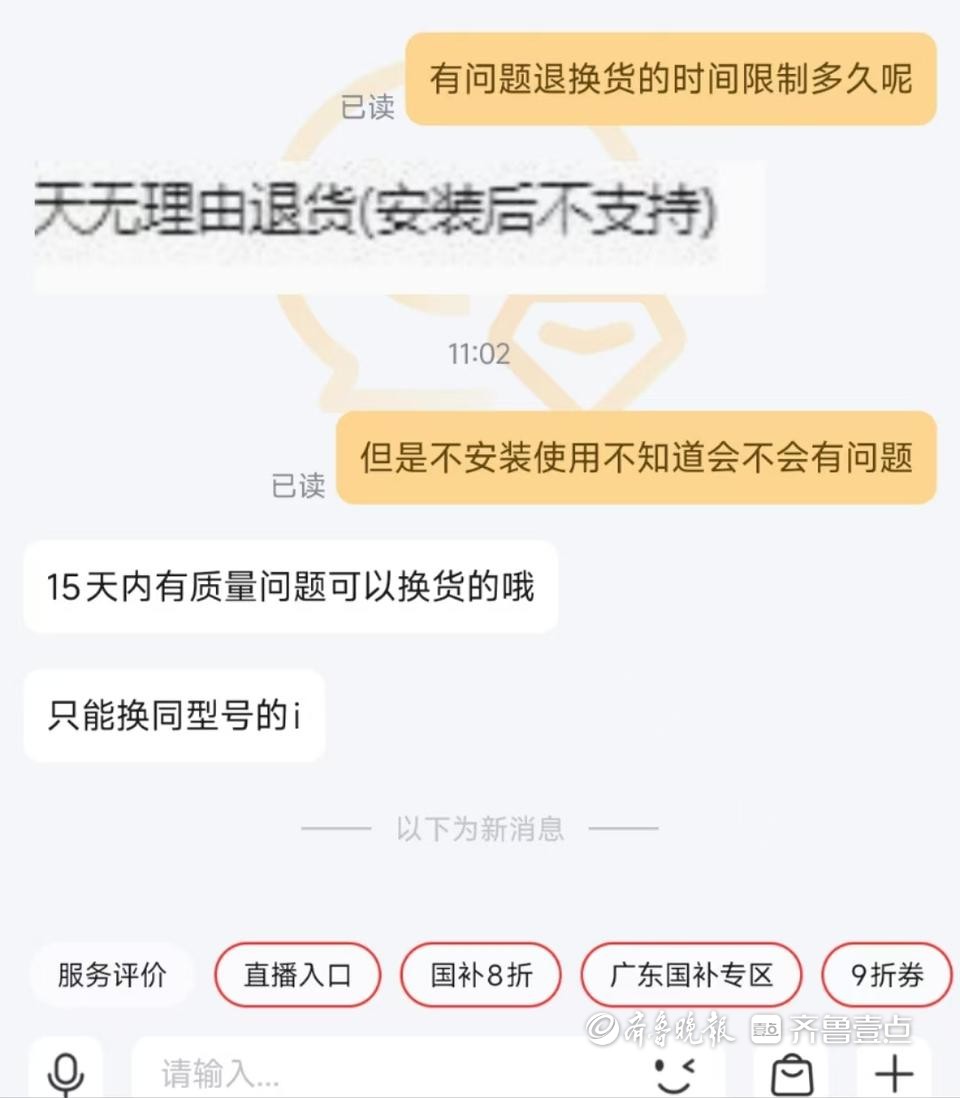 对于退换货的时间,客服表示支持7天无理由退货(安装后不支持);若安装后15天内有质量问题,可以换货,但只能换同型号机型。