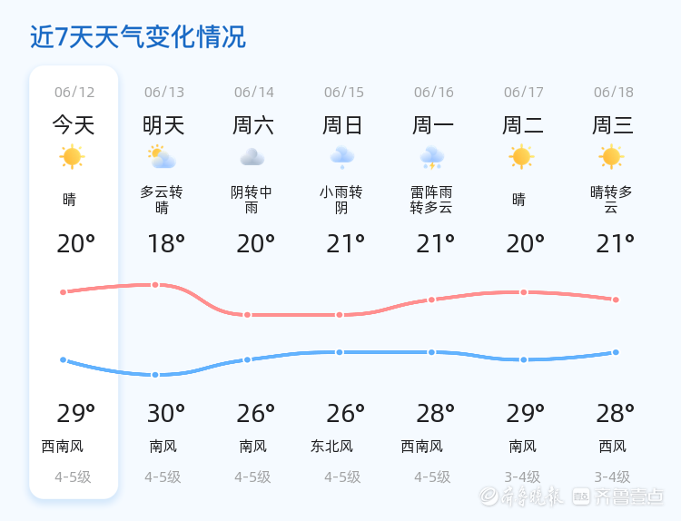 今天是6月12日,星期四,农历五月十七。威海市今天天气晴转多云,气温在20℃至29℃之间,西南风3级,空气湿度25%,PM2.5指数为30,空气质量良好。各区天气情况基本一致,均为晴转多云,风力适中,适合户外活动。市民朋友们可以放心安排日常生活和工作。