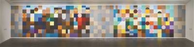 墙壁上那4米高22米长的巨幅毛毡拼接作品《Unknown》(无名),主要受到出身包豪斯学校的德国艺术家、艺术理论家约瑟夫·阿尔伯斯的色彩互动理论的影响。拼接的图形以圆形、正方形和长方形为主。画面上灰色调的部分形状单一,与其左右两侧丰富的颜色和变化有一种疏离感。因为它“突然”的暗淡,一定会引起观者的注意。我认为暗淡代表了被遗忘的部分内容。这件作品源自艺术家对两张包豪斯历史照片的想象,或者说是照片上的人物和意义在艺术家脑海里留下的印象。