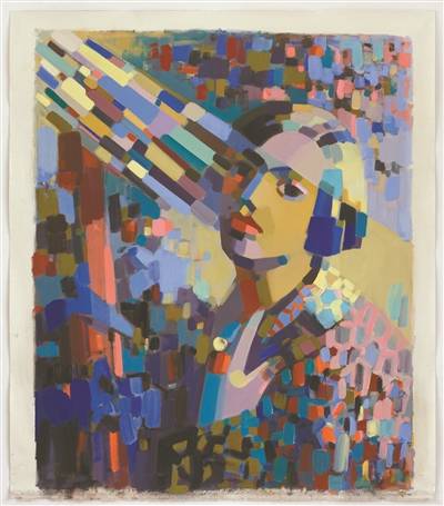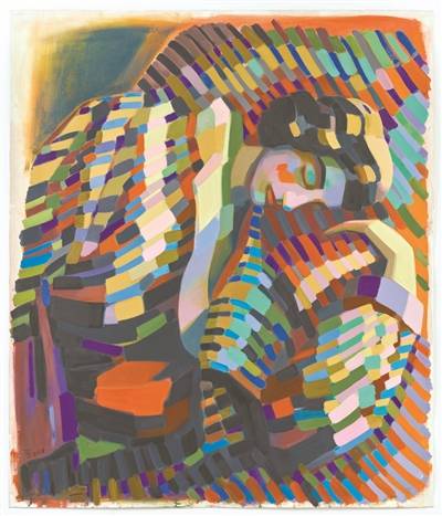 安妮·阿尔伯斯是此次展览的主要灵感来源,她于1922年成为包豪斯的一名学生。在这幅描绘安妮的画像中,头发微卷的她正用平静和询问的目光注视着观众,仿佛是在期待着他们的反馈——女性为何不能和男性一样学习同样的东西?在《安妮·阿尔伯斯在织布背景前》中,陈可把色彩与线条视作编织的元素,不断交织叠加的几何色块,使人物仿佛逐渐融入几乎抽象的几何图式之中。人物衣领的黄色在蓝色与紫色系的映衬下显得格外突出,这不仅凸显出陈可对安妮一丝不苟的工作态度的强调,似乎也映射了陈可本人作画时的状态:她在画画时的“工作服”总是整齐大方和郑重其事。