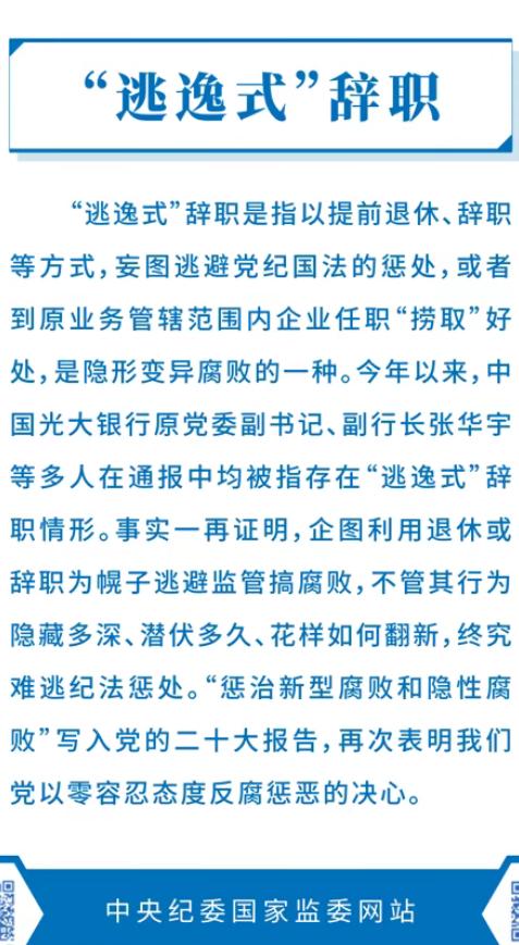 据中央纪委国家监委网站消息,所谓“逃逸式辞职”,是指以提前退休、辞职等方式,妄图逃避党纪国法的惩处,或者到原业务管辖范围内企业任职“捞取”好处。