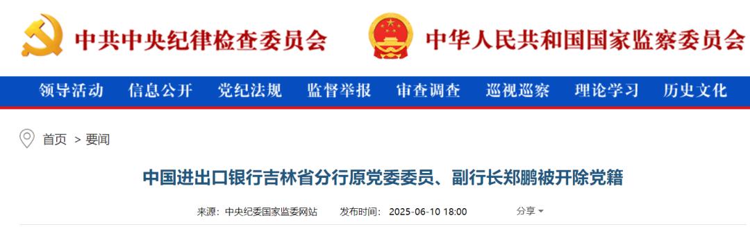通报显示,据中央纪委国家监委驻中国进出口银行纪检监察组、辽宁省纪委监委消息:日前,经中央纪委国家监委批准,中央纪委国家监委驻中国进出口银行纪检监察组、辽宁省沈阳市监委联合对中国进出口银行吉林省分行原党委委员、副行长郑鹏严重违纪违法问题进行了纪律审查和监察调查。