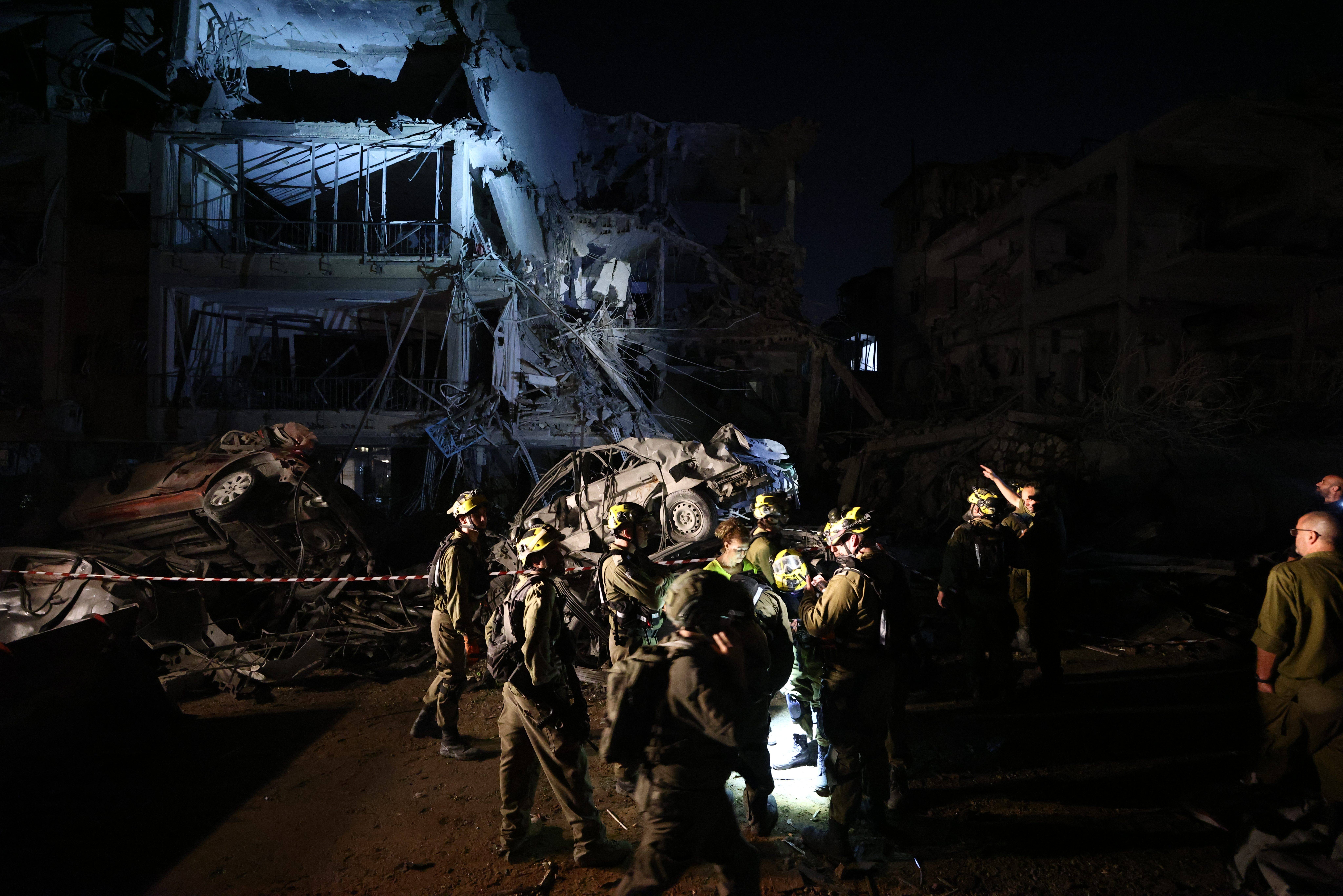 6月13日晚,应急人员在以色列中部一处被导弹袭击的地点开展救援工作。新华社发(贾马尔·阿瓦德摄)