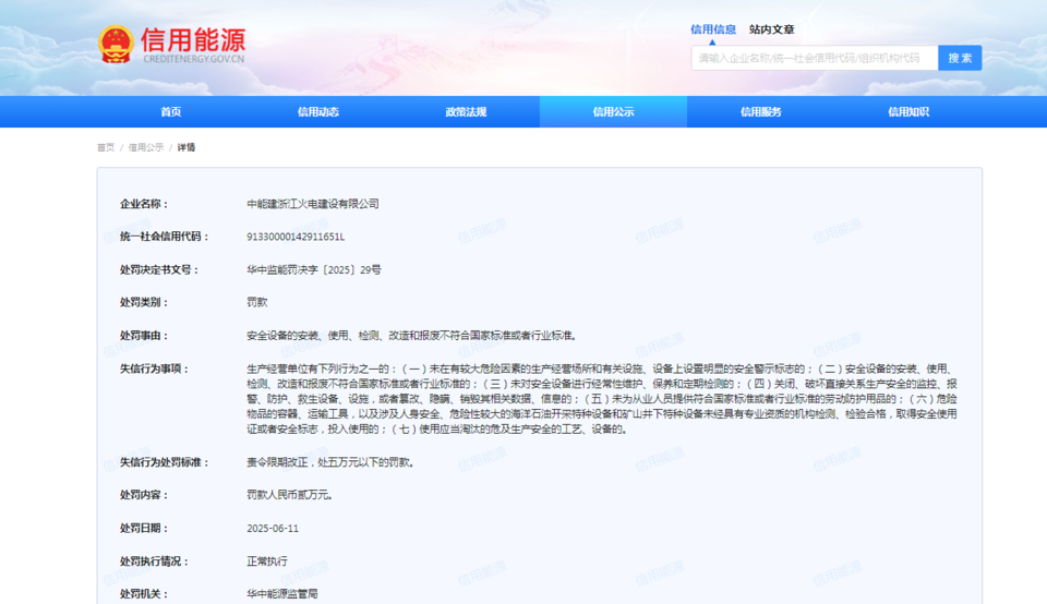 内容显示,中国能建浙江火电的处罚事由是“安全设备的安装、使用、检测、改造和报废不符合国家标准或者行业标准”。对此,华中能源监管局对其罚款人民币贰万元,处罚执行情况为正常执行。处罚决定书文号:华中监能罚决字〔2025〕29号。