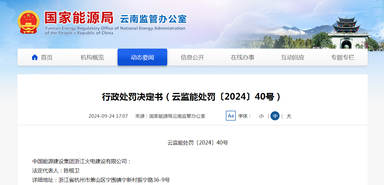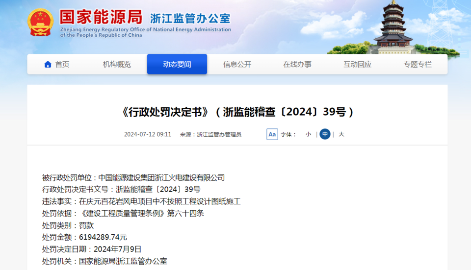 另据国家能源局浙江监管办公室公开内容,中国能建浙江火电在上年7月,还因在庆元百花岩风电项目中不按照工程设计图纸施工,被罚6194289.74元。行政处罚决定书文号:浙监能稽查〔2024〕39号。