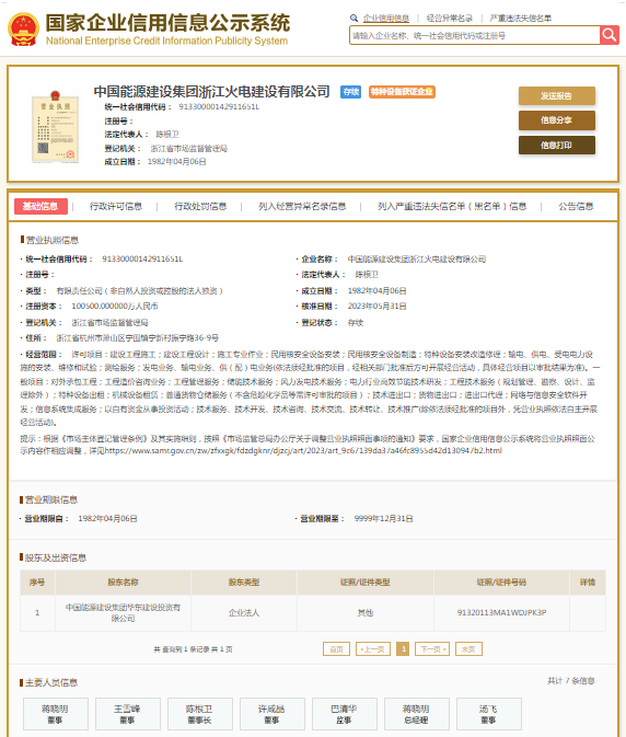 国家企业信用信息公示系统显示,中国能源建设集团浙江火电建设有限公司成立于1982年,注册资本100500万元人民币,法定代表人陈根卫,由中国能源建设集团华东建设投资有限公司全资持股。