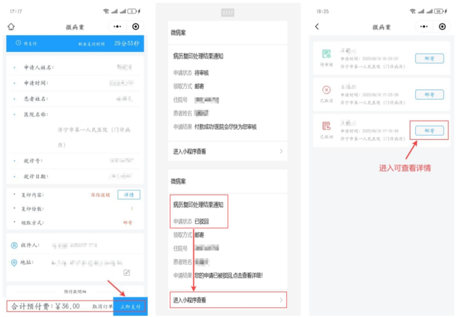 3.申请完成后请及时支付邮寄费,若30分钟内未支付订单将自动取消,同时可以通过医院微信公众号或微信服务通知查看办理及邮寄进程。