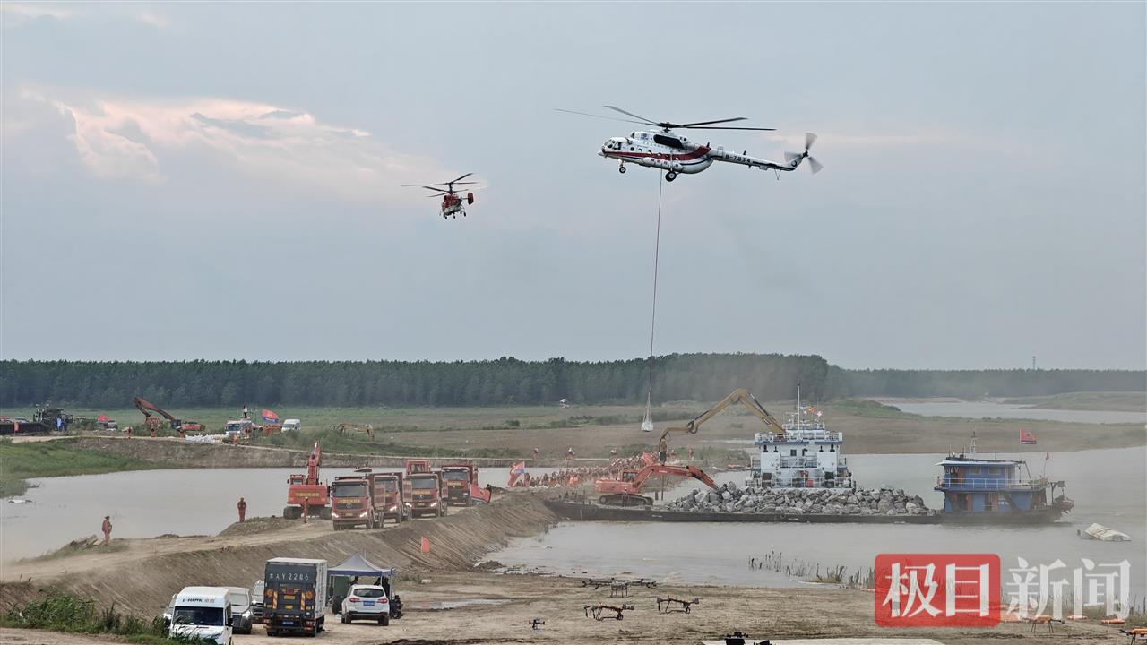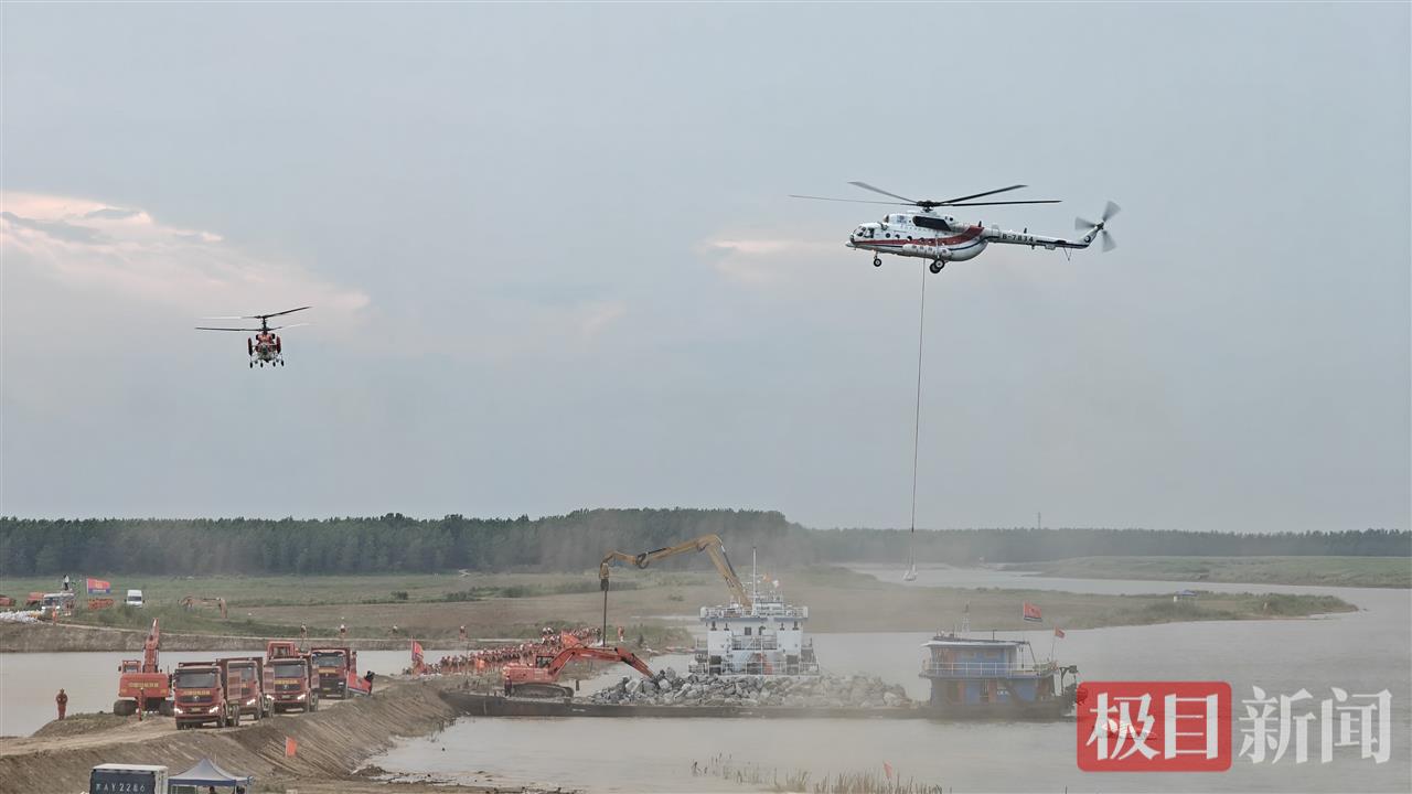 最震撼的莫过于决口封堵——模拟“湖南团洲垸堤防决口”典型险情场景,演练处置应对有方:水中,水上工程船“荆州2号”植桩机植入钢板桩,加固堤防,防止溃口扩大。石料运输船舶定点停靠在决口处,通过挖掘机将封堵块石精准投放;空中,卡-32直升机按照指令到达决口上空抛投巨包袋,米-171直升机同步空投沉箱;堤上,挖掘机装料,自卸车运输,推土机铺料、推平,采取戗堤进占的方式封堵决口。“水陆空”立体封堵决口,险情很快排除。