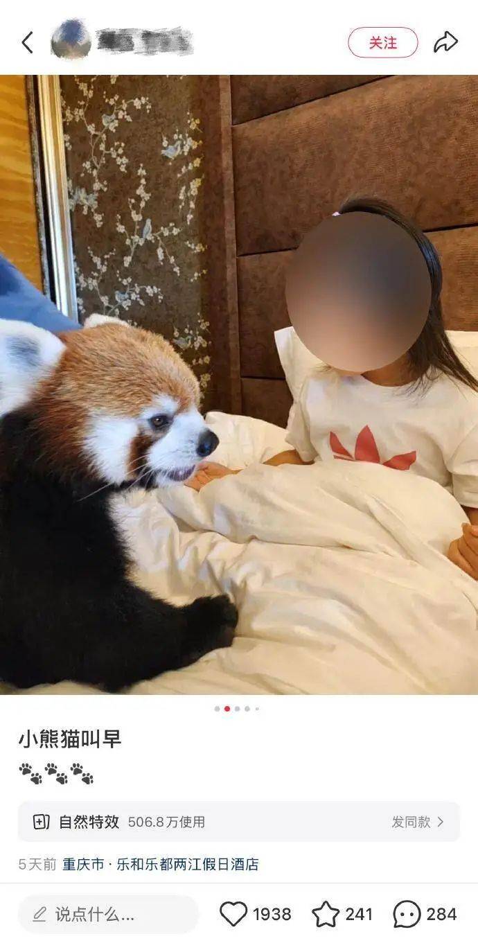 近日,有网友晒出幼童在重庆一家酒店床上与成年小熊猫的近距离互动合影,配文“小熊猫叫早”,引发热议。有网友提醒该行为的危险性,指出小熊猫咬合力极强,与幼童亲密接触或存在安全隐患。
